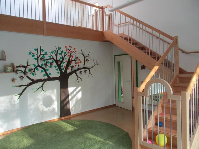 Wir haben einen großen, hellen Empfangsbereich, zwei große Gruppenzimmer mit Galerien für die Kindergartenkinder, zwei Gruppenräume für Krippenkinder und eine Turnhalle.